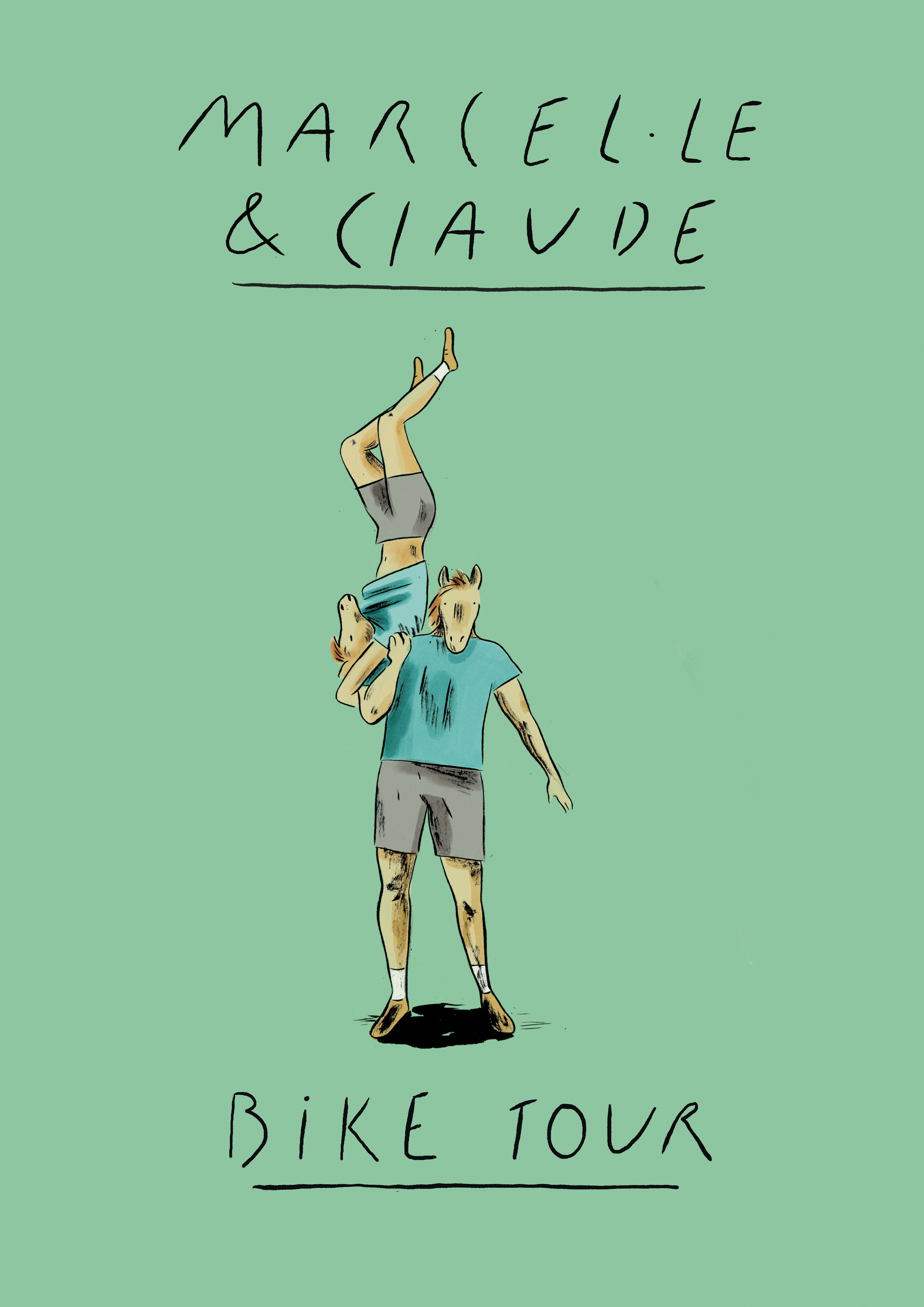 Illustration et affiche promotionnelle pour la tournée du Marcel.le & Claude Bike tour, un spectacle porté par la Dérive, association de diffusion artistique en Corrèze (19).